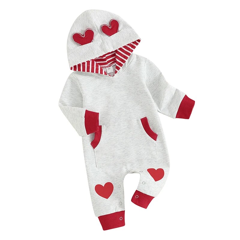 Introducing our adorable Baby Girls’ Valentine’s Day Heart Print Hooded Romper – the perfect blend of comfort, style, and love for your little angel! Designed with cozy long sleeves and a charming heart print, this gray hooded jumpsuit is an ideal choice for celebrating love, not just on Valentine’s Day but all year round. Crafted from a soft blend of 95% cotton and 5% polyester, it ensures your baby enjoys both warmth and comfort with every wear.