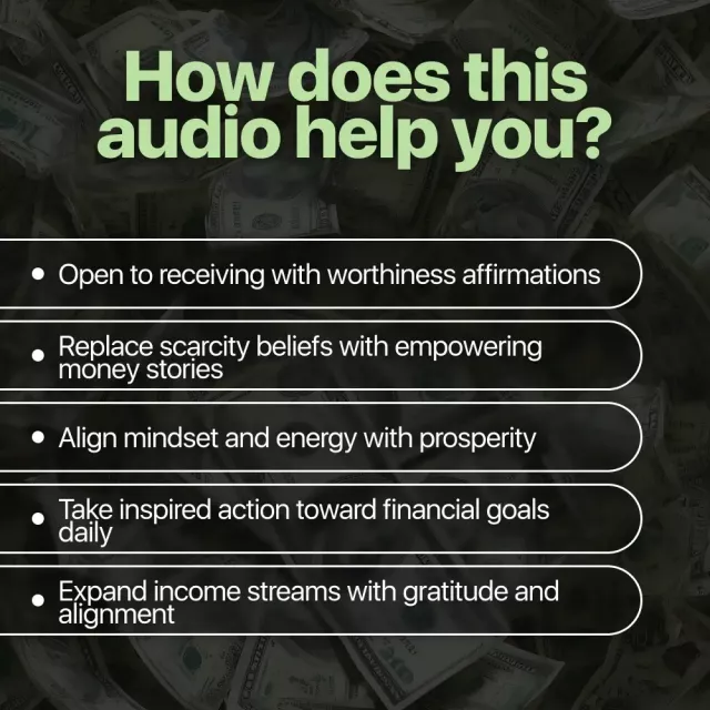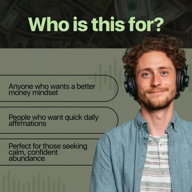 Anyone ready to strengthen a positive money mindset with gentle, consistent practice. People who want quick, uplifting audios for morning routines, commutes, or evening wind-downs. Perfect for those who prefer supportive, judgment-free language and practical affirmations they can feel right away.