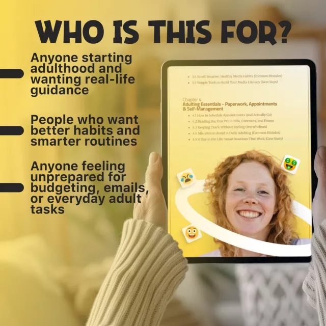 The Essential Adult Skills Guide is your go-to digital companion for mastering everyday responsibilities with clarity and confidence. Whether you’re launching into adulthood, juggling responsibilities, or just need a refresh, this guide is packed with actionable insights that make life less overwhelming and a lot more manageable. From budgeting to communication, media literacy to scheduling real-life tasks—you’ll get real answers to the questions no one teaches you in school.