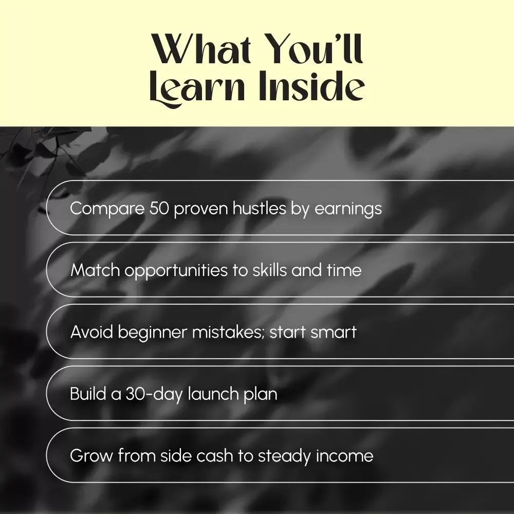 • Chapter 2: The Top 50 Side Hustles That Actually Pay — 2.1 Freelancing & Digital Skills • 2.2 Gig Economy Jobs • 2.3 Online Hustles • 2.4 Creative & Craft-Based • 2.5 Educational Hustles • 2.6 Passive Income Ideas • 2.7 Local Services •  Practical Feature: Common Mistakes to Avoid When Starting Out